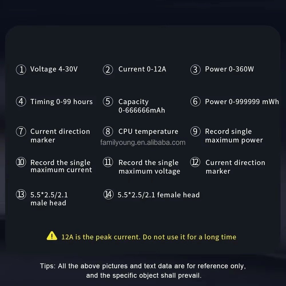 | Specification | Voltage 4-30V Current 0-12A Peak Time 0-99H Bidirectional |